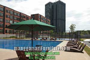 Umbrella Pool / Payung Kolam renang dan Kursi sun Lounger/Kursi kolam renang/Kursi malas adalah Outdoor Furniture yang di peruntukkan sebagai kursi berjemur di area kolam renang ataupun pantai. Kursi Sun Lounger di kombinasi dengan Umbrella / Payung di tengahnya merupakan salah satu produk unggulan yang menjadi furniture paling menarik untuk dijadikan pelengkap Furniture kolam renang baik untuk kolam renang pribadi maupun apartemen, hotel dan kolam renang umum lainnya. seperti yang telah kami pasang di Area kolam renang Apartemen SkyGardeng Setiabudi Kuningan Jakarta Selatan. Kursi Lounger dan Payung kolam renang yang kami produksi ini sudah banyak di pakai banyak client terutama apartemen dan hotel. Kursi Lounger dan payung umbrella yang kami produksi didukung dengan kualitas unggulan, kami tawarkan dengan 2 bahan dasar, yaitu bahan kayu jati dan bahan rotan sintetis, untuk umbrella/Payung ada 3 Bahan yaitu Kayu jati, Besi dan Stainless. Selain sebagai perlengkapan kolam renang Kursi Lounger dan meja payung kolam dapat mempercantik lokasi kolam renang dan taman sekitar. Pengerjaan kursi lounger dan set meja payung cafe/taman di kerjakan oleh orang yang ahli di bidangnya sehingga hasilnya akan memuaskan.