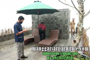 | Bahan | : | Meja Bahan kayu jati grade B Kursi Rotan Sinetis Payung kayu jati + Kain SUntech |